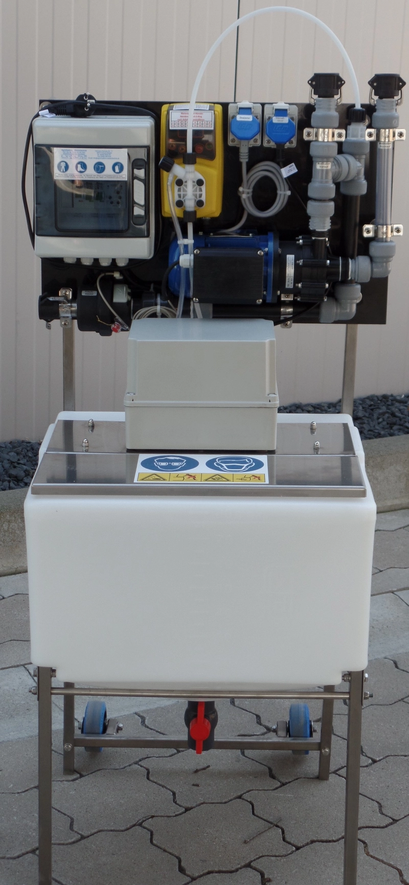 • 110 Liter Kunststofftank (trichterförmig) mit Literskala, Sumpf und Rührwerk für das Konzentrat